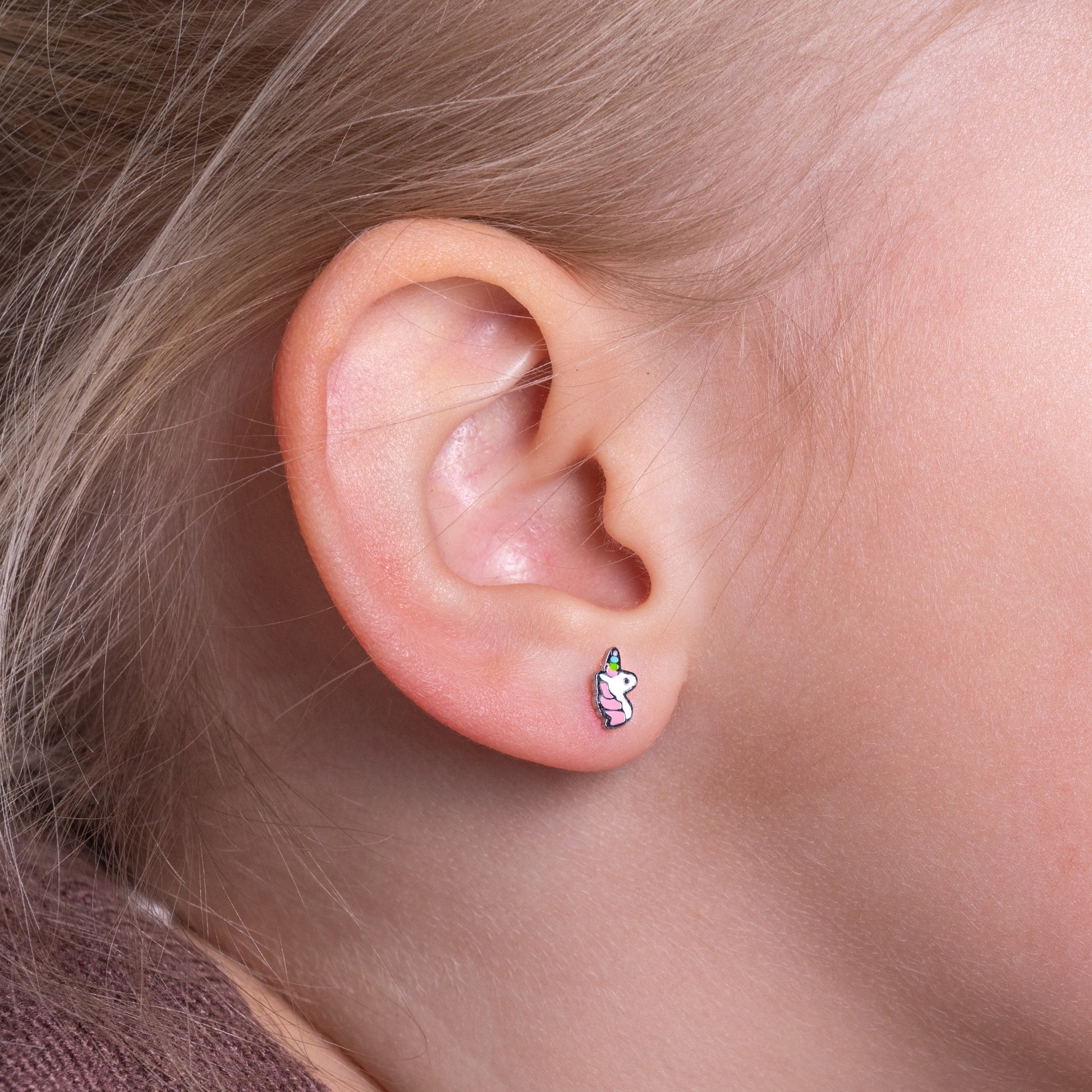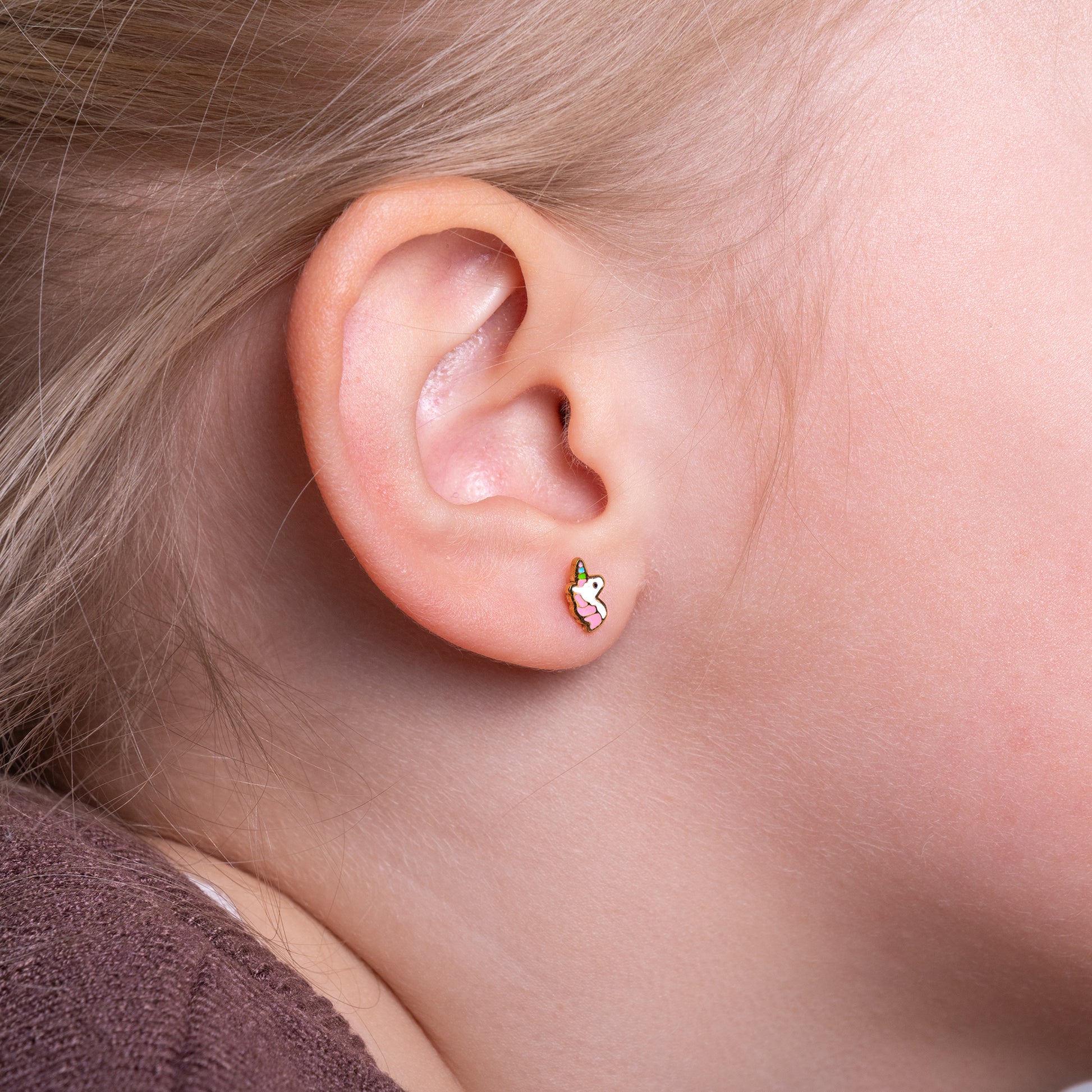 Comfortabel voor alle kinderoren: dun staafje, platte schroefsluiting en hypoallergeen, nikkelvrij materiaal. Veilig om altijd te dragen – slapen, spelen of zwemmen.