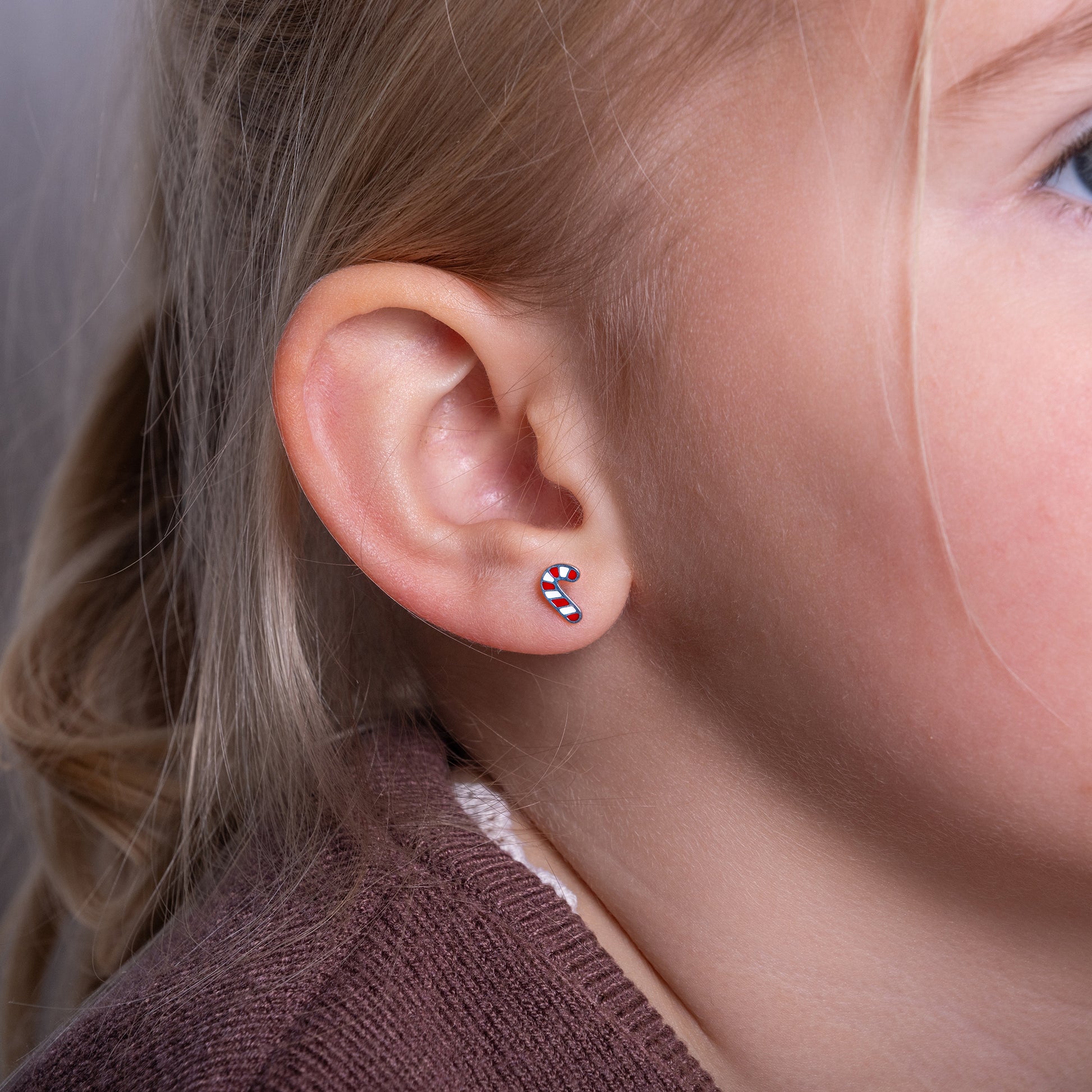 Een zoete klassieker in oorbelvorm! Deze zilverkleurige zuurstokjes zijn een vrolijke toevoeging aan elke winteroutfit. De oorknopjes hebben een platte schroefsluiting die niet prikt en goed blijft zitten tijdens spelen, slapen of buitenspelen. Dankzij het dunne, kindvriendelijke staafje zijn ze perfect voor gevoelige oortjes en pas geschoten gaatjes. Erg leuk voor de feestdagen!